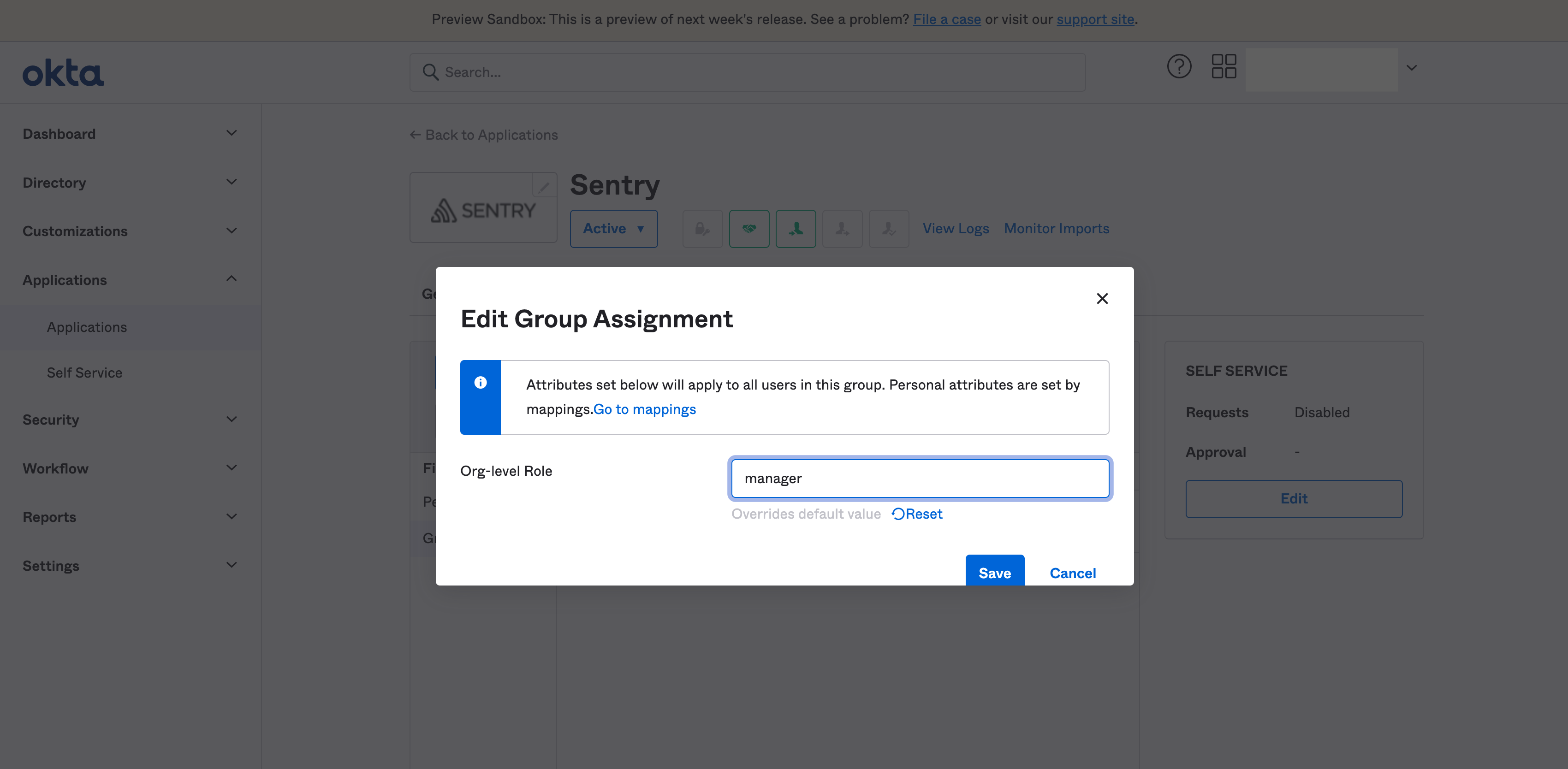 If you use Okta to assign organization-level roles, you’ll be unable to make membership changes through Sentry and will need to continue using Okta. To change a user's organization-level role, you will need to deprovision and then reprovision them with the new role.